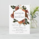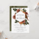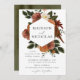 Elegant autumn wedding invitations featuring your names inside of a hexagon-shaped frame surrounded by watercolor flowers and greenery in muted autumnal colours of ivory, orange, mustard gold, olive green, dusty rose, and brown. The fall floral wedding invitations reverse to display a rich olive green watercolor background. Designed to coordinate with our Boho Autumn Floral wedding collection.