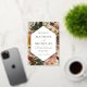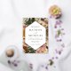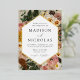Elegant autumn wedding invitations featuring your wedding details nestled in a gold foil geometric frame surrounded by watercolor flowers and greenery in muted autumnal colours of ivory, orange, mustard gold, olive green, dusty rose, and brown. The fall floral wedding invitations reverse to display a rich olive green watercolor background. Designed to coordinate with our Boho Autumn Floral wedding collection.