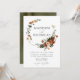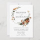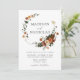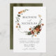 Elegant autumn wedding invitations featuring your names encircled by a wreath of watercolor flowers and greenery in muted autumnal colours of ivory, orange, mustard gold, olive green, dusty rose, and brown. The fall floral wedding invitations reverse to display a rich olive green watercolor background. Designed to coordinate with our Boho Autumn Floral wedding collection.