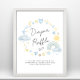 Cute whimsical boho baby boy shower diaper raffle drop off poster sign featuring pastel blue and yellow watercolors of a rainbow, sun, hearts, stars, moons and clouds and "Diaper Raffle" in a stylish calligraphy script.