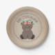 Baby shower paper plates featuring an illustration of a baby bear cub wearing a flower crown. Background is card stock inspired. Personalise the name.