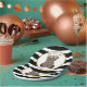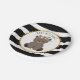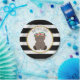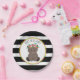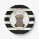 Baby shower paper plates featuring an illustration of a baby bear cub wearing a flower crown inside a circle with pompom inspired design.  Background is black and white stripes. Personalise the name.
