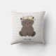 A pillow featuring a woodland themed design with an illustration of a baby bear over a grey wood background. Personalise the name. Bear is wearing a flower crown.