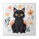 On this ceramic tile, a black cat with yellow gold eyes gazes out. The cat has hygge style pattern embellishment, with flower and leaf decorations in blue and gold surrounding it.