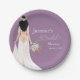 This boho-themed paper plate features a stunning boho bride with black hair in a delicate lace wedding dress. Adorned with a lush bouquet of roses, pampas grass, eucalyptus, and ranunculus.