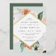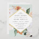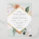Elegant floral bridal shower invitation features a diamond shaped frame of watercolor flowers and foliage in boho desert inspired shades of peach, white, ivory, and sage green, and finished with gold foil trim. Personalise with your bridal shower details.