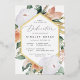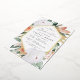 Elegant floral baby dedication invitation features an elongated hexagonal frame of watercolor flowers and foliage in boho desert inspired shades of peach, white, ivory, and sage green, and finished with gold foil trim. Personalise with your church dedication ceremony and party details in modern lettering.