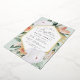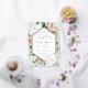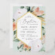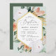 Elegant floral baptism invitation features an elongated hexagonal frame of watercolor flowers and foliage in boho desert inspired shades of peach, white, ivory, and sage green, and finished with gold foil trim. Personalise with your church baptism ceremony and party details in modern lettering.