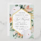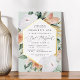 Elegant floral bat mitzvah invitation features an elongated hexagonal frame of watercolor flowers and foliage in boho desert inspired shades of peach, white, ivory, and sage green, and finished with gold foil trim. Personalise with your temple or synagogue ceremony and party details in modern lettering.