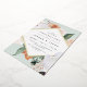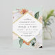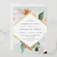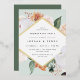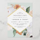 Elegant floral engagement party invitation features a diamond shaped frame of watercolor flowers and foliage in boho desert inspired shades of peach, white, ivory, and sage green, and finished with gold foil trim. Personalise with your engagement party details in modern lettering.