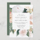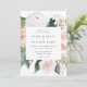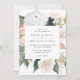 Elegant floral wedding invitation features your wedding details in modern lettering, set in a square frame of pastel watercolor flowers and botanical foliage in desert inspired earth tone shades of peach, sage green, white and ivory.