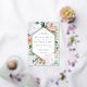 Elegant floral wedding invitation features your wedding details in modern lettering, set in a geometric elongated hexagon shaped frame of pastel watercolor flowers and botanical foliage in desert inspired earth tone shades of peach, sage green, white and ivory. Gold foil trim completes the look for a luxe touch.