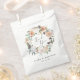 Boho chic event or wedding favour bags say thank you to guests in elegant style. Bags feature a watercolor wreath of sage green botanical foliage and pastel earth tone flowers in shades of peach, ivory, and white, framing "thank you" in calligraphy script lettering. Personalise with your names or event name and date beneath in modern lettering. Designed to coordinate with our Boho Blooms wedding and event collection.