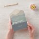 A all-in-one wedding invitation ideal for an outdoor or mountain wedding, with a retro boho vibe. The design featutres white 1970's style font over a digital illustration of mountains and forest trees in various shades of blue.