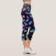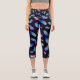 BOHO BLUE PINK FEATHER PATTERN CAPRI LEGGING, COLORFUL BRIGHT GRADIENT BLUE PINK FEATHER FALLING ON BLACK BACKGROUND