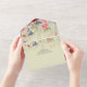 ALSO AVAILABLE WITH A QR CODE TO SCAN IN THE RSVP AREA. This design features a dusty blue, pink, and red flower border with greenery on a soft green background. Personalised All-In-One invitations are a unique combination of both a beautifully printed custom invitation with an easy to tear off perforated RSVP postcard. And they are so easy to use! You simply fold, then seal the back flap with the three included clear stickers, and mail. And when your guests receive your custom invite, they just tear the perforated RSVP Card off and drop it back in the mail to you!