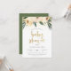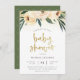 This bohemian invitation features "baby shower" in a brushed faux gold script, framed by confetti, three blush pink flowers and watercolor foliage. Your details appear underneath in an elegant typography. The cards reverse to a beautiful shade of green with a simple white pattern. This design is great for outdoor events or floral themed showers.