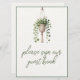 Introducing our exclusive guestbook sign, a stunning blend of sophistication and nature-inspired elegance. This sign features a delicate watercolor illustration of a hanging plant, artfully suspended in a chic macramé hanger. The hand-drawn design exudes a sense of breezy sophistication, making it the perfect addition to any modern, stylish event. The soft green hues of the plant, paired with the refined typography, create an effortlessly chic aesthetic that is both timeless and contemporary.