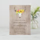 Boho Bull Skull wedding invitation with sunflowers on a wood background. The flowers sit on top of the skull head. The back of the invitation has a darker brown wood background.