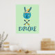Cute Boho blue bunny face with crossed arrows and "Explore" decorated text on pastel green background