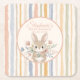 Celebrate a new arrival with these whimsical storybook-inspired paper drink coaster. This design features a hand-painted watercolor bunny centered among soft meadow wildflowers and a muted vertical stripe border. Perfect for a gender-neutral woodland baby shower or a sweet spring birthday celebration.