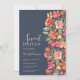Boho burnt orange earth tone floral chic sweet 16 invitation featuring hand painted terracotta, pink, peach, yellow and red flowers with green leaf and greenery foliage on dark blue background with a brushed script typography.