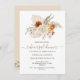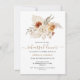 This rehearsal dinner invitation features a bohemian burnt orange floral bouquet that includes flower in various tones of burnt orange and natural tones. The arrangement also features some pampas grass and palm leaves.