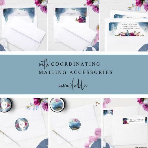 Unique wedding invitation with exquisite watercolor stains creating a celestial frame encasing your wedding details and beautiful bohemian floral on the centre in a graceful blend of blue, navy, turquoise teal, purple, fuchsia, mustard and golden hues. Wording with bride or groom's parents names on top which can be changed to "the pleasure of your company is requested for" instead. Same invitation with "both bride and grooms parents names" on top wording, as well as with "together with their parents"/"with great joy" also available. Modern hand written calligraphy details. Back with attractive watercolor stains, corner floral detail and section with couples initials. Part of our "Mystic Garden Celestial" collection with a variety of coordinating products available.
