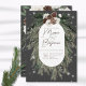 This design features a rustic green pine and pinecone bouquet on a charcoal background with white flowers. It is accented with a white sparkle overlay to illustrate the magic of the beautiful winter holidays. Perfect for a Christmas or winter wedding. This card is part of the Boho Green Pine Winter Sparkle Wedding Suite created by Simply Farmhouse Press.