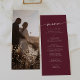 This boho chic burgundy red photo wedding menu card is perfect for a minimalist wedding. The dark maroon wine red modern bohemian design features simple rustic calligraphy with a unique yet classic style.