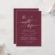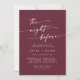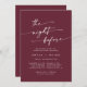 This boho chic burgundy red rehearsal dinner invitation is perfect for a minimalist night before wedding rehearsal. The dark maroon wine red modern bohemian design features simple rustic calligraphy with a unique yet classic style.