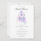 An elegant, boho chic bridal shower invitation featuring a romantic, feminine dream catcher painted in modern watercolor, simple typography and a pattern of hand-painted feathers on the back, over an indigo, blue and purple background.