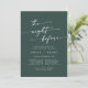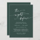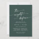 This boho chic emerald green rehearsal dinner invitation is perfect for a minimalist night before wedding rehearsal. The dark and moody hunter forest green modern bohemian design features simple rustic calligraphy with a unique yet classic style.