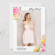 Class of 2024!! A boho chic spring, summer floral watercolor graduation announcement invitation featuring soft pastel pink, yellow and orange floral watercolor and gold glitter confetti typography graduation party invite with hand painted flowers, greenery watercolor leaf branches with gold geometric terrarium frame on editable white background, add your photo at the back, perfect for open house !