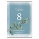 Collection holds several iterations for table cards, featuring watercolor florals and botanicals. In this instance, it features a beautiful eucalyptus branch. A blue watercolor wash for background provides a modern boho and dreamy look which contrasts the white textured double frame and enhances the white typography on the card.