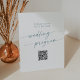 This boho chic teal and white QR code wedding program pedestal sign is perfect for a minimalist wedding. The blue green and white modern bohemian design features simple rustic calligraphy with a unique yet classic style reminiscent of the coastal beach and a summer ocean cruise.