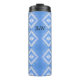 The tie dye look of this blue and white thermal tumbler with a chequered pattern of outlined diamonds of black and white, is a bright airy design inspired by white clouds and black telephone wires against a clear blue sky. It is Boho chic with a hint of hippie with its diamonds in the sky look. It is a naturally beautiful bright geometric pattern that you Personalise with Initials.