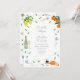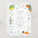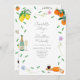 Beautiful modern colourful watercolor wedding invitation with simple boho botanicals, orange and lemon citrus theme ideal for a sunny summer wedding. Original artwork by artist Catherine Sweetman includes foliage, wildflowers, cheese and wine, musical notes and flutes of bubbly. Whimsical handwriting and modern typography script with easy to personalise templates to add names, the date and other essential information along with the bride and grooms initials on the sparkling wine bottle label illustration. Colour palette includes lemon, yellow, orange, green, blue, purple and pink.