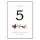 Rustic and boho wedding table number featuring watercolor illustration of chickens.