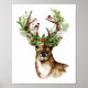 A boho Christmas wall art print of a deer with birds and holly on it's antlers