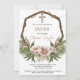 A Christmas Baptism Invitation featuring a wooden wreath adorned with pine needles and delicate pink flowers at the bottom exudes a rustic yet elegant charm. The invitation's appearance is a harmonious blend of traditional and contemporary elements, perfect for celebrating a meaningful occasion during the holiday season.