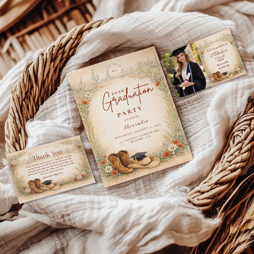 Celebrate your graduate with a warm western-inspired design featuring classic cowgirl boots, delicate wildflowers, and soft prairie grasses framing the layout. The earthy neutral palette of beige, sage, dusty blue, and warm terracotta creates a refined ranch aesthetic that feels both modern and timeless. Perfect for country-loving grads, rodeo girls, or anyone who dreams bigger under open skies. A beautiful blend of rustic charm and elegant botanical detail for a memorable graduation celebration.
