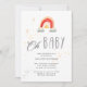 Boho baby shower invitation featuring rainbow with clouds illustrations in red and orange paired with a personalised script font. Check out our store for more matching items from this collection.