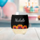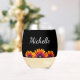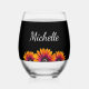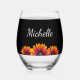 Rustic floral stemless wine glass, with a boho daisies design on a black background. With white customisable script typography lettering you can add your own name. Great for adding a botanical style to your entertaining.