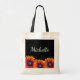 Boho floral tote bag, with a rustic daisies design on a black background. With white customisable script typography lettering you can add your own name. Great for adding a botanical style to your accessories.