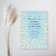 The daisies design on a blue background is an exquisite and charming theme for a bridal shower party invitation. The vibrant and lively hues of the daisies, delicately painted with watercolors, create a sense of natural elegance and grace. The intricate details of the design are visually captivating, with each daisy and leaf carefully placed to create a harmonious and seamless pattern. The blue background adds a touch of serenity and tranquillity to the overall composition, creating a perfect balance between liveliness and calmness. The design is a wonderful representation of the bride's personality, showcasing her free-spirited and whimsical nature. It is an invitation that exudes joy, warmth, and celebration, and is sure to leave a lasting impression on all those who receive it. Suitable items are available. Сheers!
