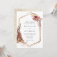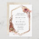 Elegant, unique floral wedding invitation featuring your wedding details framed by burgundy, purple, blush, and coral watercolor flowers, rich beige and brown earth tone foliage, and a faux gold foil geometric frame. The invite reverses to a light beige watercolor background.