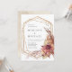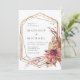 Elegant, unique floral wedding invitation featuring your wedding details framed by a faux gold foil geometric frame with a bouquet of burgundy, purple, blush, and coral watercolor flowers with rich beige and brown earth tone foliage. The invite reverses to a light beige watercolor background.