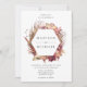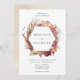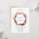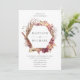 Elegant, unique floral wedding invitation featuring your names inside of a hexagon frame of burgundy, purple, blush, and coral watercolor flowers and lush foliage in rich beige and brown earth tones. Personalise the floral invitations by adding details such as wedding date, time, venue, and reception information. The invite reverses to a light beige watercolor background.