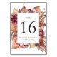 Elegant, desert floral wedding table number cards featuring burgundy, purple, blush, and coral watercolor flowers and lush foliage in rich brown earth tones.. Personalise by adding the table number, your names, wedding date, etc. Design repeats on reverse side. Coordinates with our Boho Desert Floral wedding invitation suite.